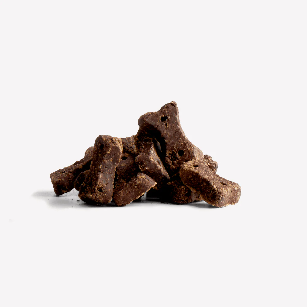 A soothing blend of carob, chamomile and quinoa to help with your dog’s daily siesta, like easing into a mug of warm cocoa. Carob is a healthy chocolate alternative for dogs, making each soft-baked biscuit all the more tempting. Finally, something chocolatey approved for your four-legged friend. We’ve added chamomile for its calming qualities and quinoa for its antioxidants and protein. Pocket-sized and compostable packaging approved, ready to grab and go.